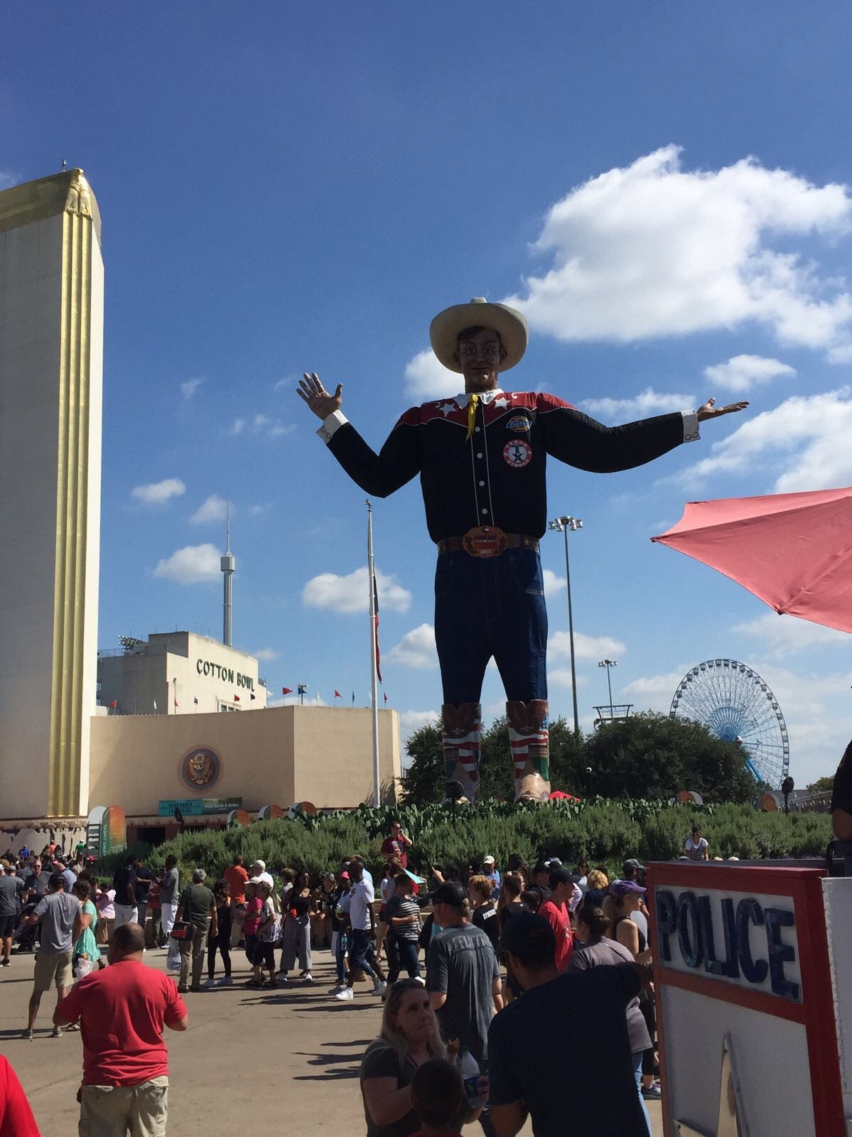 En la parte central de la feria, hay una estatua de un cowboy gigante, la ponen todos los años, segun dicen: The nicest cowboy in all Texas. Cada año lleva una camisa distinta: