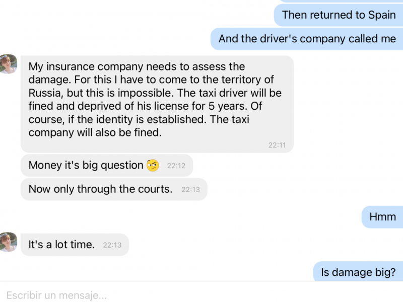 Esto en unos 3 dias, pues ahora ya esta identificado, y su licencia preventivamente retirada, y se ira a juicio en breve. . Mi amiga se queja que al final, no va a valer de mucho para que se lo pagen, pues su coche está asegurado en Rusia..no en Bielorusia.