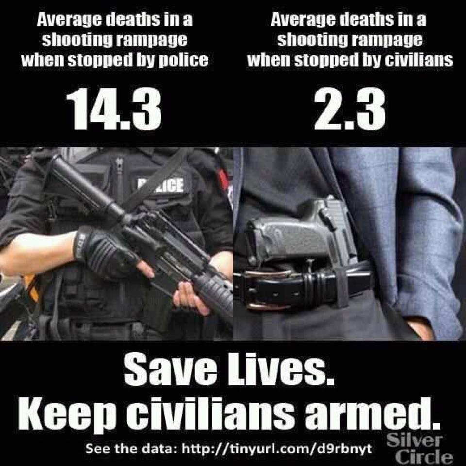 Pues aparentemente el Ciudadano Legalmente Armado es capaz de incapacitar al Tirador Activo y parar la masacre antes que el Policía, o por lo menos, antes de que el número de victimas se dispare.