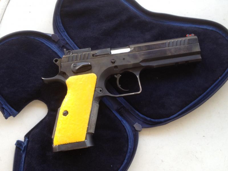Esta es una Tanfoglio Stock III. Las cachas de madera originales han sido pintadas de color.