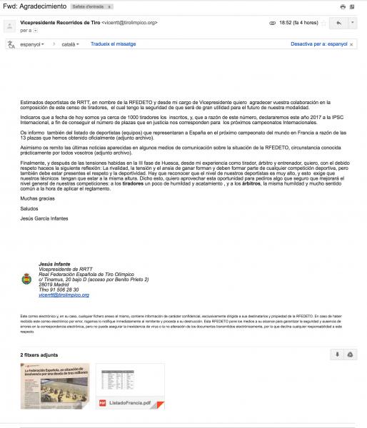 Finalmente, y después de las tensiones habidas en la III fase de Huesca, desde mi experiencia como tirador, árbitro y entrenador, quiero, con el debido respeto haceos la siguiente reflexión: La rivalidad, la tensión y el ansia de ganar forman y deben formar parte de cualquier competición deportiva, pero también debe estar presentes el respeto y la deportividad. Hay que reconocer que el nivel de nuestros deportistas es muy alto, y esto exige que nuestros técnicos tengan que estar a la misma altura. Dicho esto, quiero aprovechar esta oportunidad para pediros algo que seguro que mejorará el nivel general de nuestras competiciones: a los tiradores un poco de humildad y acatamiento , y a los árbitros, la misma humildad y mucho sentido común a la hora de aplicar el reglamento.