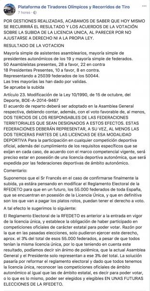 Hay que defender a los tiradores pero con el voto de todos ellos y hacer lo que salga de las votaciones, esa es la verdad y la realidad, lo demás no sirve de nada, volverán a tomar las poltronas y sus cargas privilegiados y mando y ordeno, siempre fue así y seguirá siendo así en este país nadie hace nada por nada, cobrando si y llevándose el dinero como lo habéis visto, en fin hacer lo que queráis, las armas están mal vistas y nadie hará nada para que esto funcione, un Saludo.