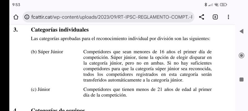 Respecto a la normativa de pistola que cuelgas, ¿la has leído? punto 6.3.1, solo categoría junior (menos de 21 años) y súper junior (menos de 16 años).