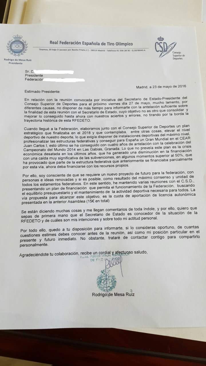 Según nuestras noticias totalmente contrastadas, la reunión celebrada el día de ayer en el CSD, a la que estaban convocados por Rodrigo de Mesa los Presidentes de las Federaciones Territoriales y en la que ha participado el Secretario de Estado para el deporte, Sr. Cardenal, una vez más por 12 votos en contra de la subida y seis a favor, Rodrigo de Mesa Ruiz pierde su última oportunidad de cargar sus deudas millonarias a todos los federados de España.