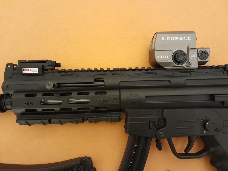 Preparada para IPSC Minirifle, solo la he probado en galeria a 25 m. donde se ha comportado estupendamente. He sacado alza y punto convencional y he montado el holográfico de la Leupold convergente a 25 m. y un láser "sin marca" que funciona de maravilla, paralelo a la línea de fuego.