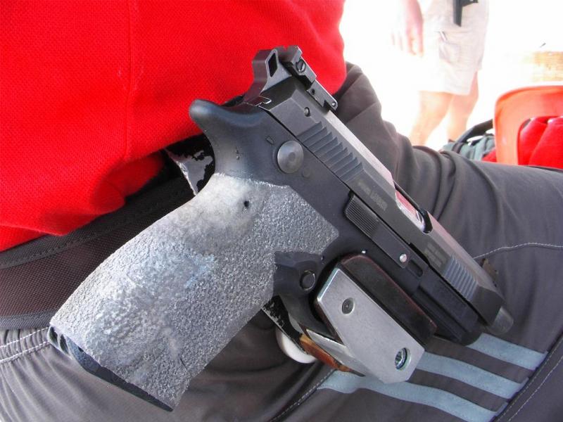 El contorno de la empuñadura es lo normal, lo que no puedes es en el botón de retenida o en el resto del armazón y corredera.
