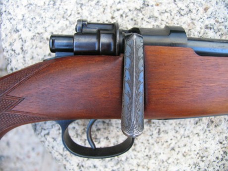 Tiene la culata acabada por mí al aceite, cantonera roja de goma maciza, puntal teñido, cañón flotado, rampa elevadora limada para acerrojar en vacío, y limpiado de cañón en armería (creo que lo llamaron desescombrado, eso que se hace con espuma)