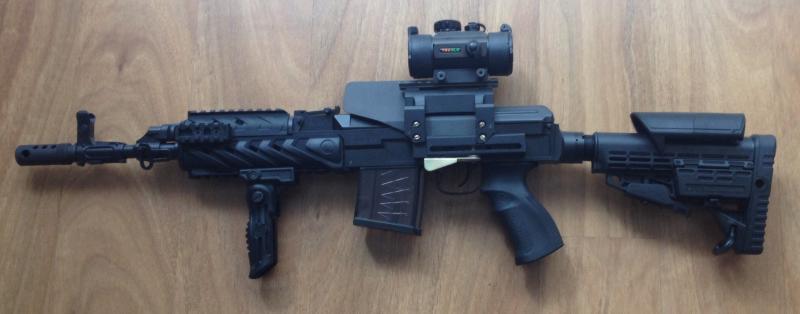 Tiene Guardamanos, carrillera, Grip delantero, bocacha apaga llamas, montura lateral para visor, visor de punto rojo, tres cargadores ( los dos originales, negro y transparente de polimero de 30 cartuchos y uno especial corto de 5 cartuchos).