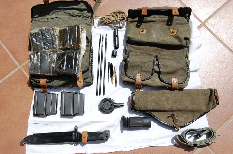 Dos bolsas porta cargadores, 4 cargadores sin abrir de su paquete, 2 cargadores más usados y uno limitado a 3 tiros para la caza, baqueta, aceitera, aguja percutora de repuesto, funda cubre visor y ocular de goma.