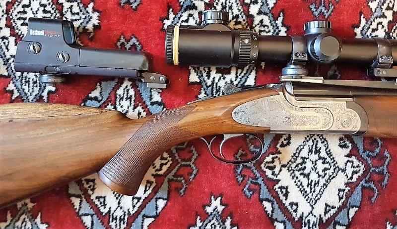Pletina Larga. Grabada con motivos de caza. Gatillo único. Expulsores automáticos. Culata de pistola, carrillera tipo Baviera y delantera a cola de castor en nogal seleccionado, picado, acabado al aceite. Ajuste anatómico en culata.