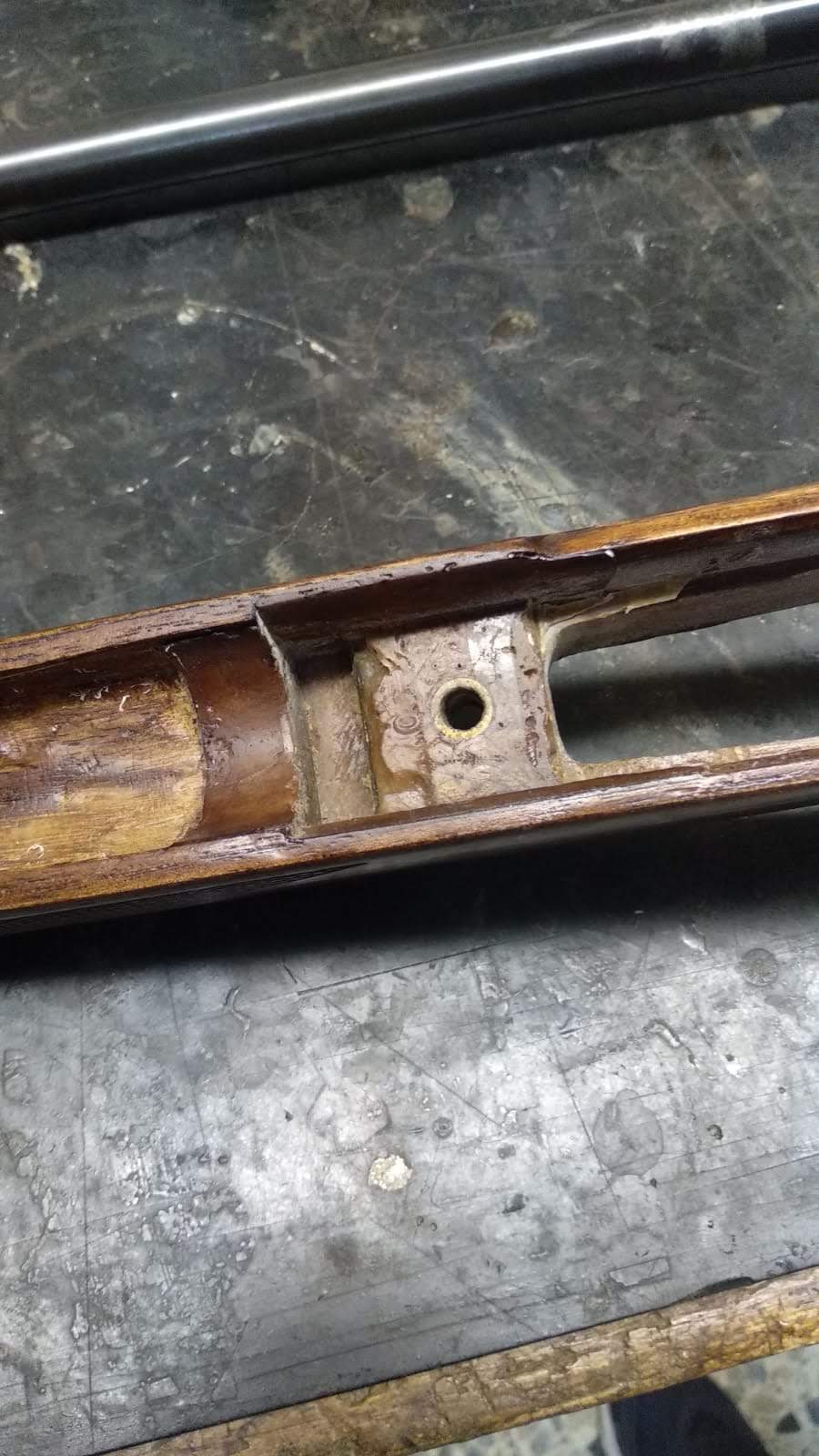 Como se ve en la foto con el folio, tiene hecho el encame en Epoxi y el cañón está flotado. No toca la madera.