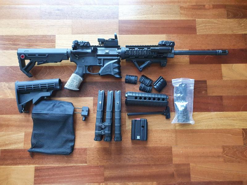 Palanca de carga sobredimensionada y la original, guardamanos con carriles (protectores aún por colocar), guardamanos original también incluido, culata original y otra de strike army, guardamanos en entrada de cargador y frontal, recoge vainas, 2 cargadores Magpul de 30 limitados a 2 balas pero que pueden deslimitarse, Clip Magpul de unión, otro cargador Magpul de 30 deslimitado, 1 cargador de 10 deslimitado, Punto rojo idéntico al tasco, alzas abatibles de Polímero, punto laser y soporte, TODO 1425€. Tengo algún accesorio más que entregaría con la compra.