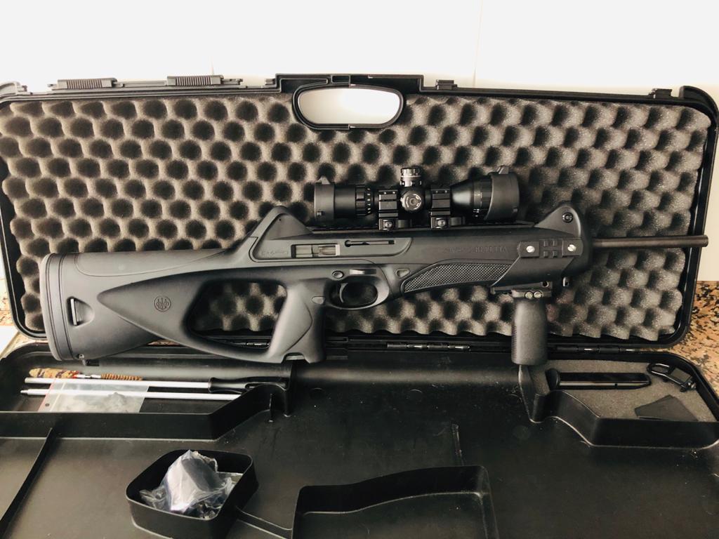 Se entrega con maleta original Beretta CX4 storm, dos cargadores, empuñadura, carril picatinny, accesorio portafusil y con visor UTG 3-9X32 con retícula iluminada en verde y roja.