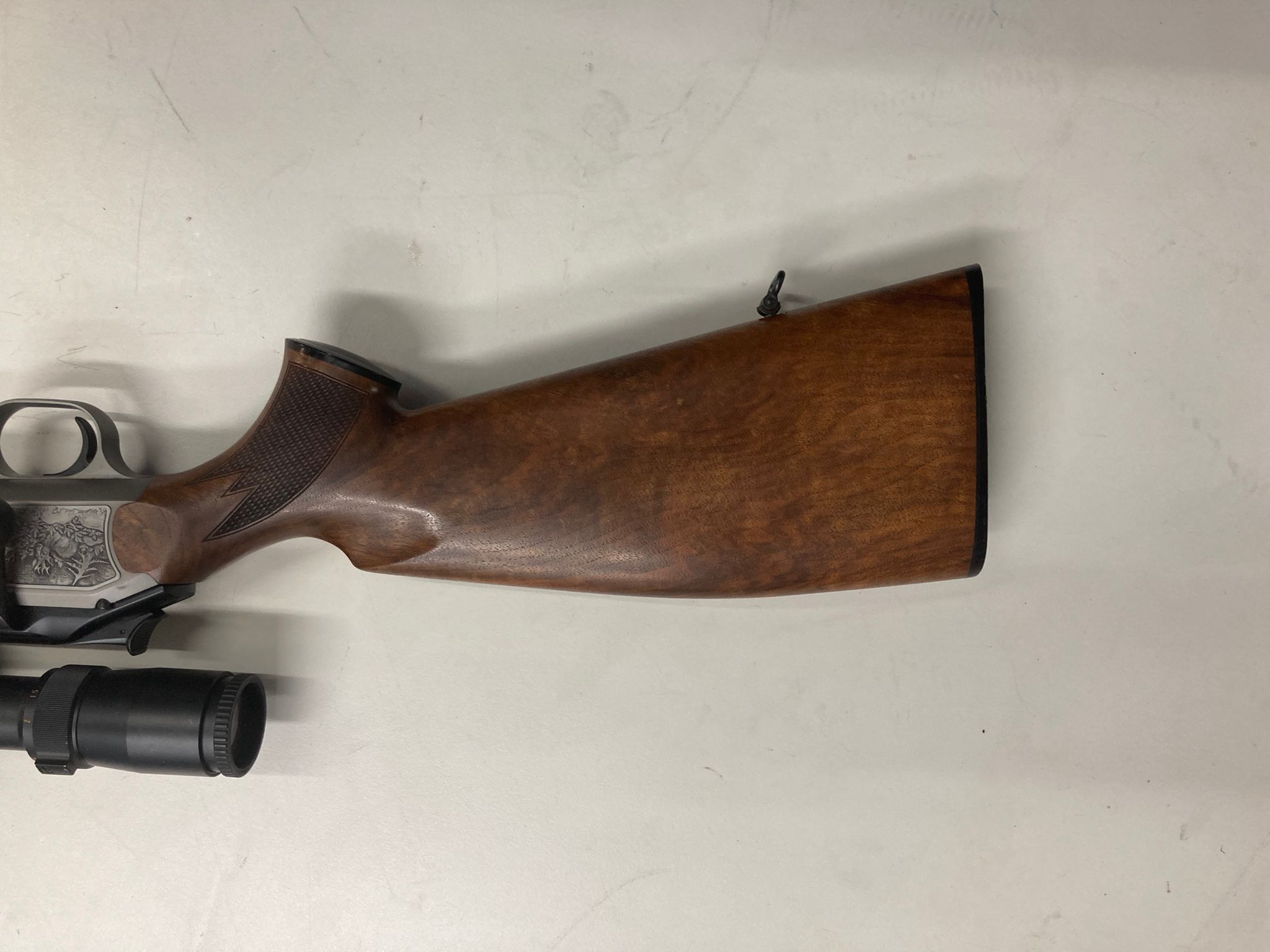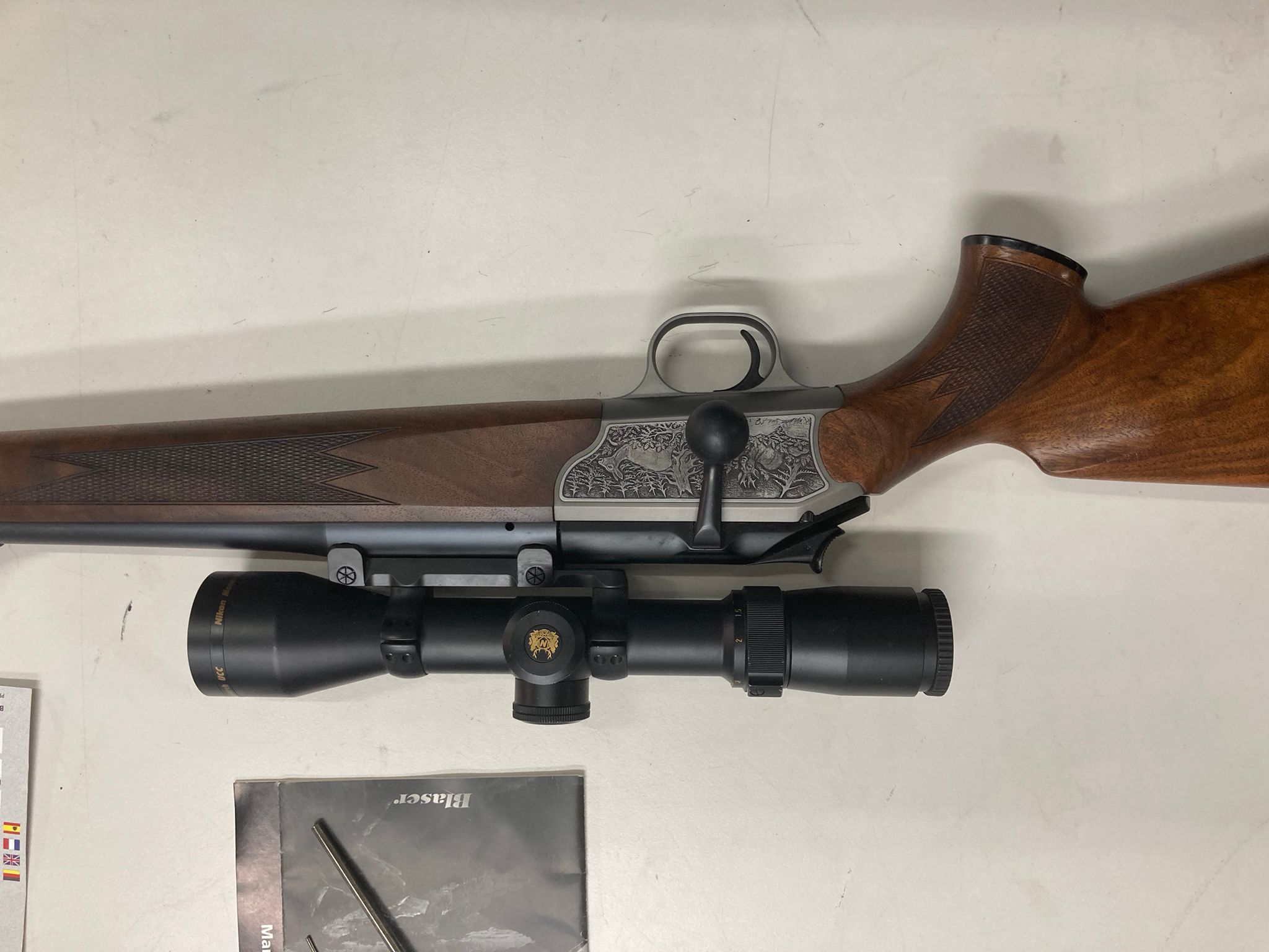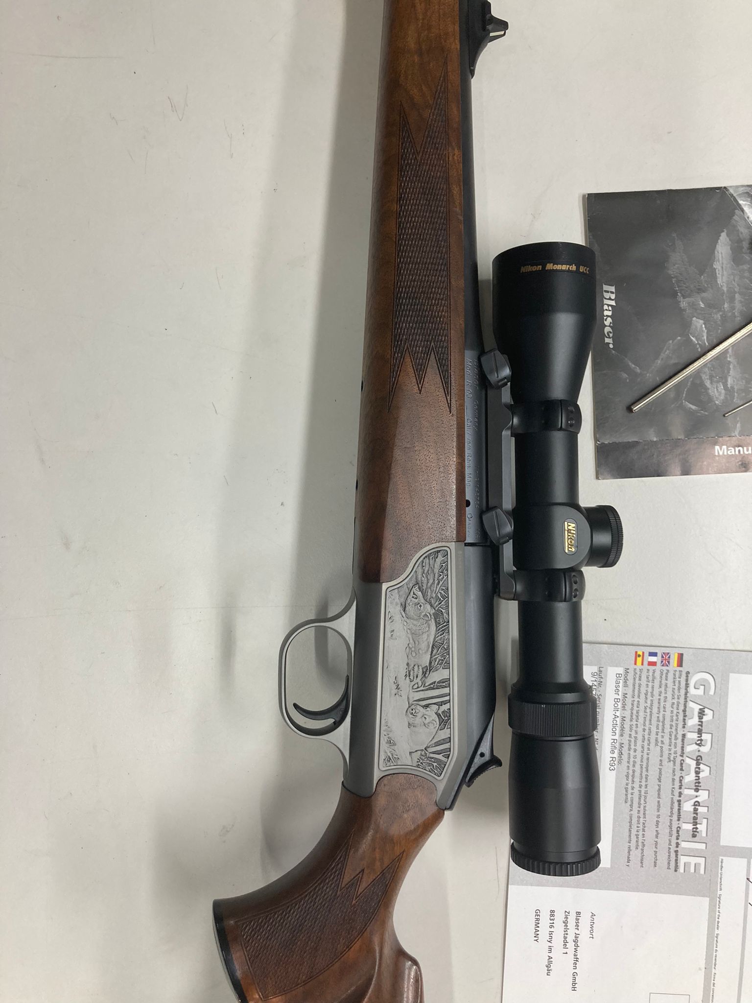 El cañón lleva magnaport y el rifle está impecable. El conjunto va equipado con monturas Blaser y un visor Nikon Monarch UCC 1,5-6 × 42.