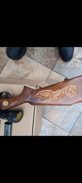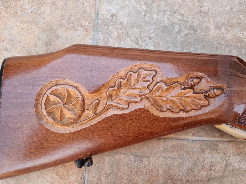 150e sin visor . como se ve tiene la madera tallada y una moneda incrustada..no preguntar jjj ...pavón en la mira un poco del uso resto del cañón perfecto..funcionamiento perfecto ..ideal para pintar la madera al gusto. En mano en Madrid. Zona mostoles. Sin visor con 1 cargador. Si se quiere visor se podría ver...