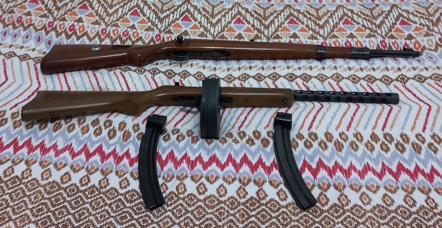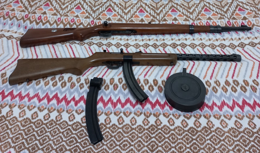 Vendo dos carabinas del cal. 22LR, una Pietta PPS-50 (réplica del subfusil soviético PPSH-41), y una Norinco JW25 (réplica del alemán Mauser Kar 98K), en buen estado, con señales normales de uso.