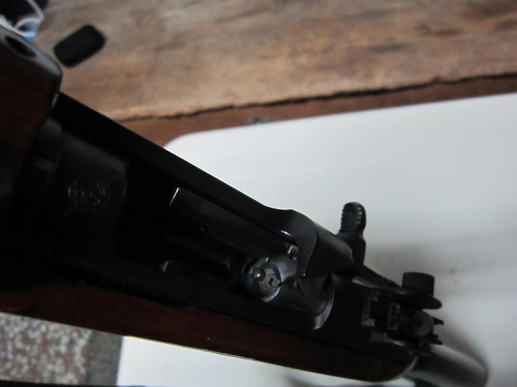 La mira trasera es también peculiar, y el enganche de bayoneta, y la cantonera, y la palanca de montaje, ...
