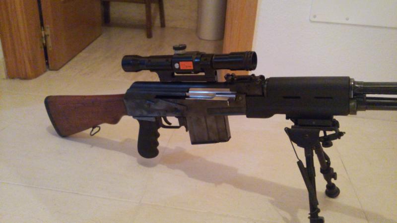 El zastava ha sido repavonado, pavón brillante. Le he cambiado el disparador por uno aligerado Tapco G2. Tiene guardamanos y pistolete Hogue con railes para acoplar accesorios, aunque también acompaño maderas originales.