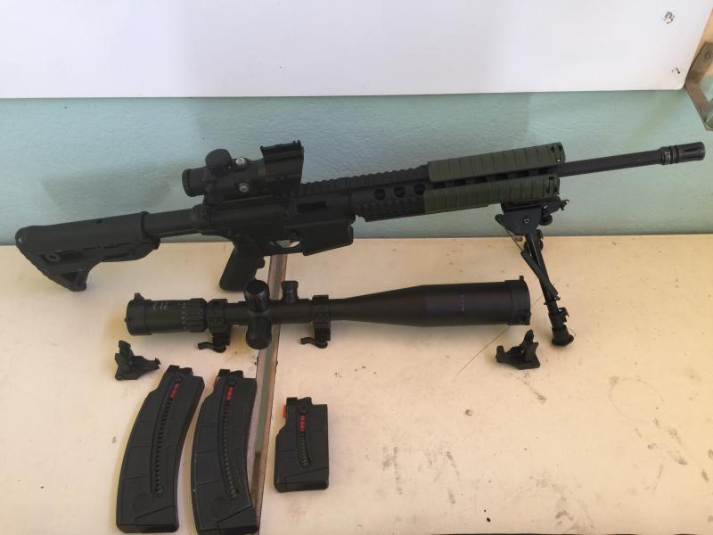 Buenas vendo carabina con 2 cargadores de 25 cartuchos y 1 de 10 con bipode ncstar,miras abierta abatibles con un visor de 4x32 con reticula iluminada,visor letherwood de 7-30x50 y tubo de 30mm reticula mil-dot y anillas tacticas,funda transporte y otra culata todo por 850 euros se puede probar en Valencia gastos de envio a cargo del comprador