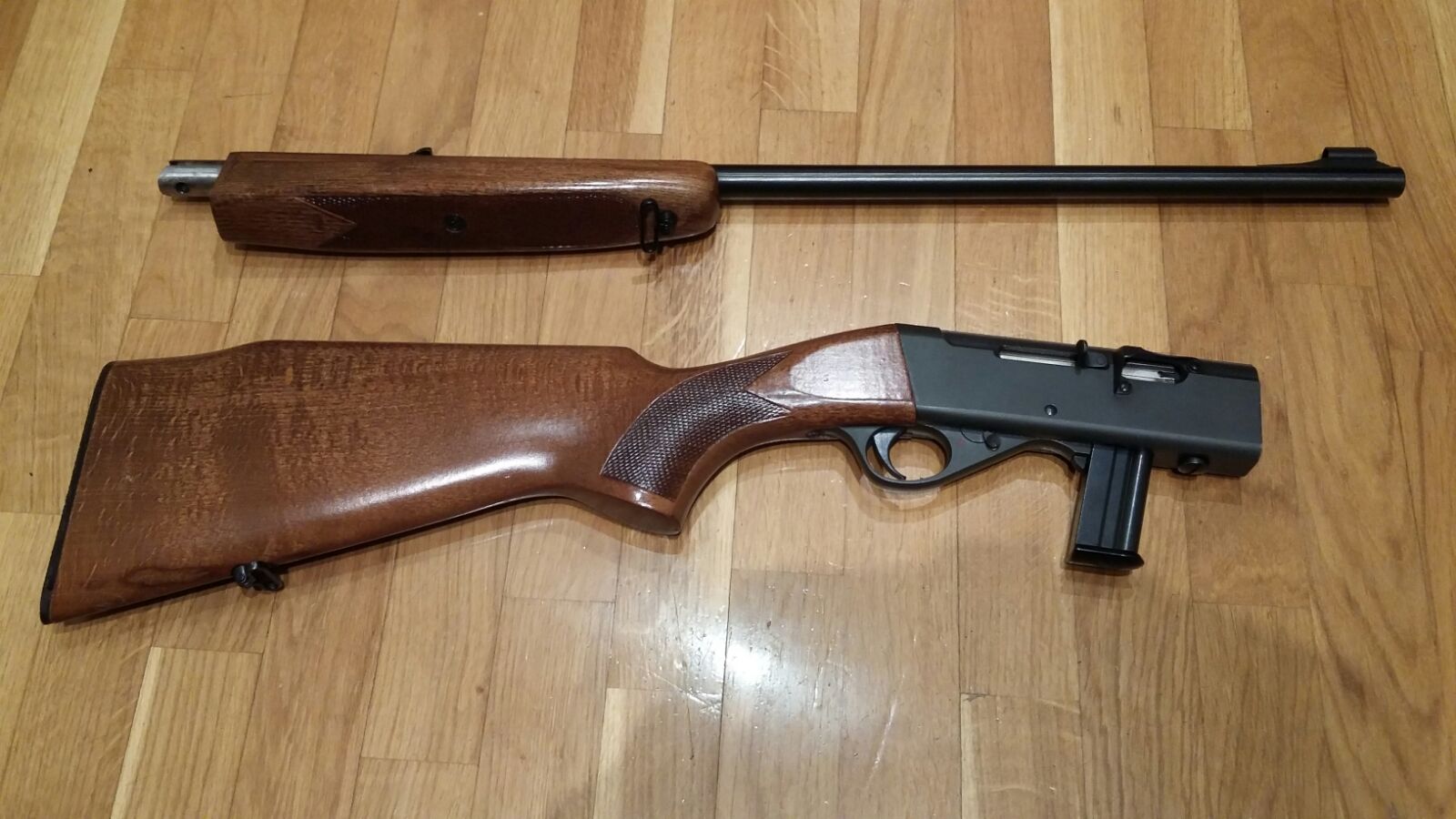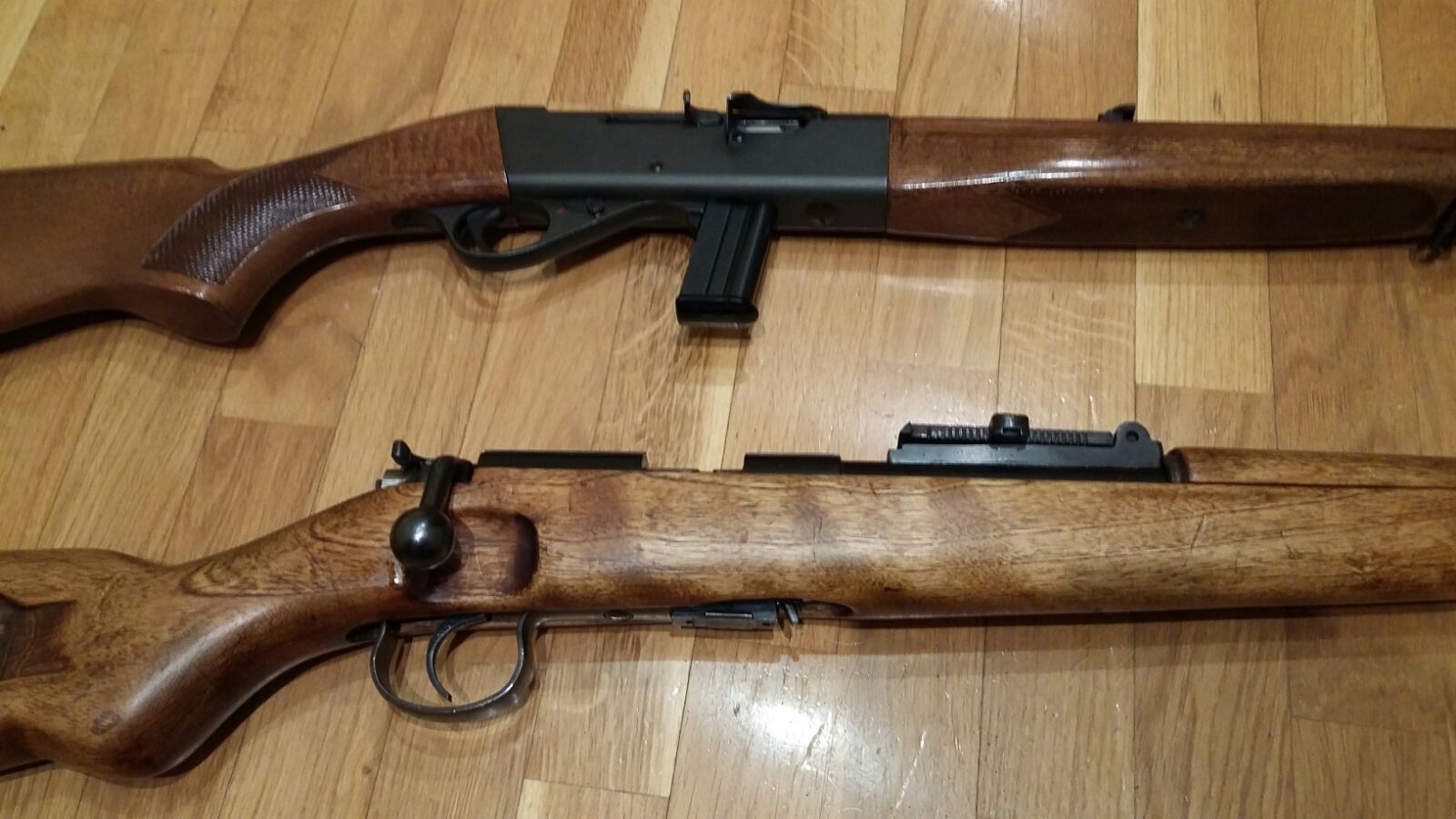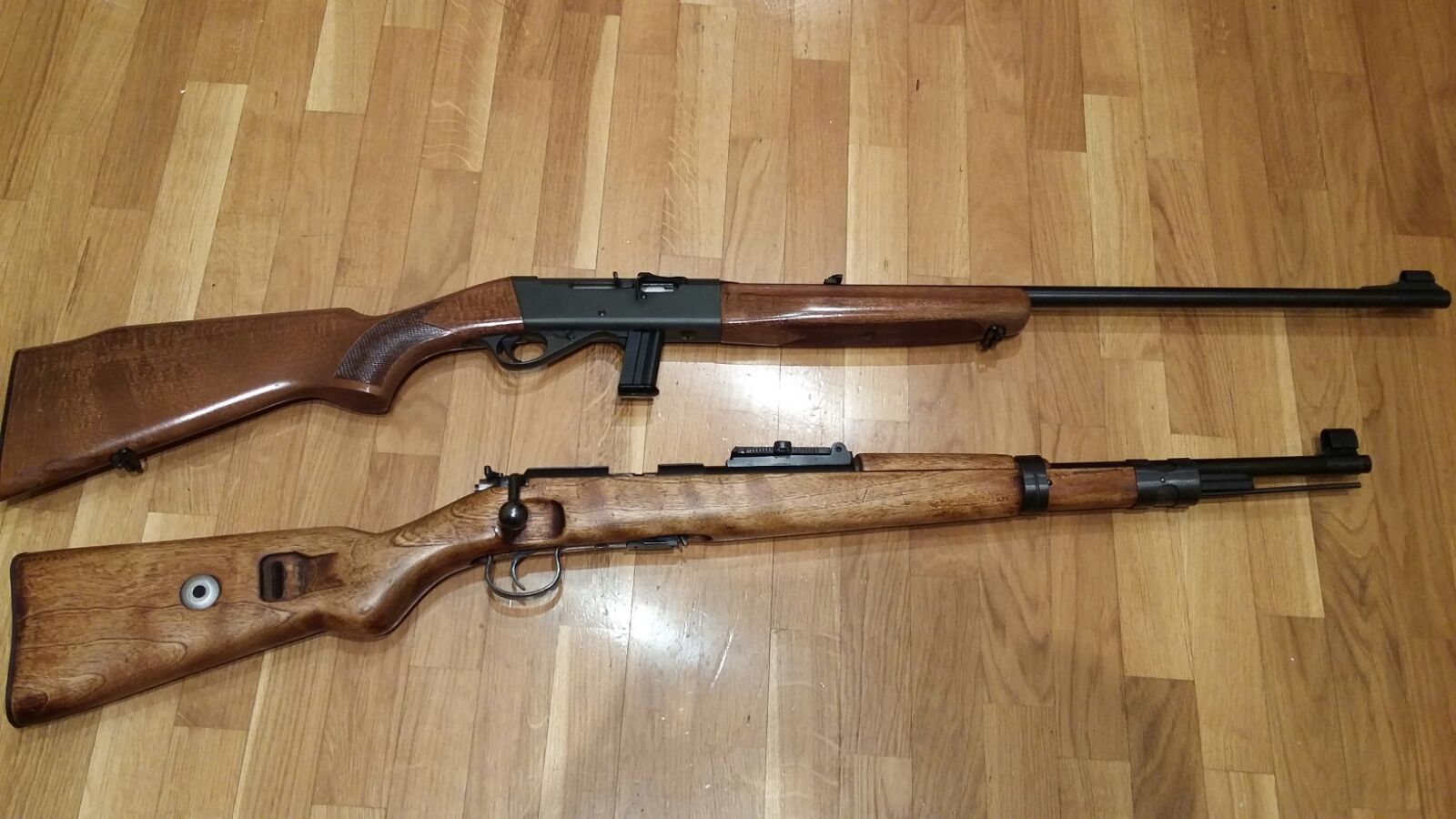 - La Norinco esta recien lijada y aceitada la madera. Es la primera versión algo mas corta (97 cm creo). Punto de mira afinado. Un cargador de 5 tiros.