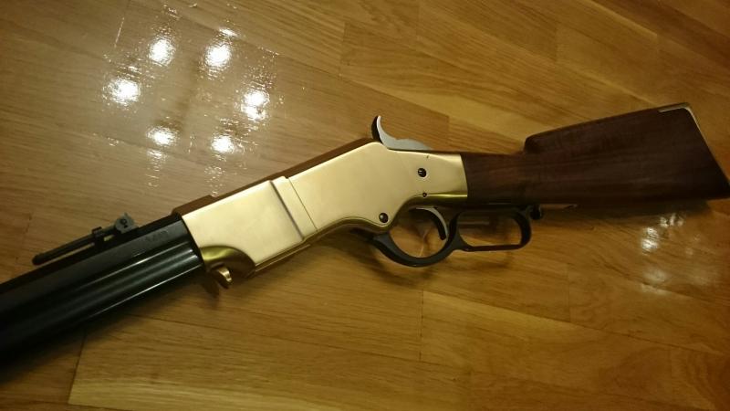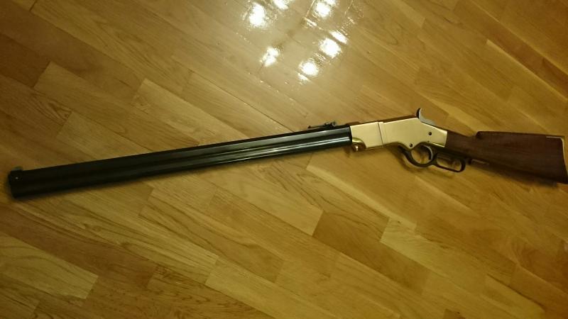 Pongo a la venta esta estupenda réplica del Henry 1860 fabricada por Uberti en calibre 44-40. Puede disparar sin problemas tanto cargas de pólvora nitro como, por supuesto, pólvora negra. Tiene el armazón de latón pulido y culata de nogal terminada al aceite.