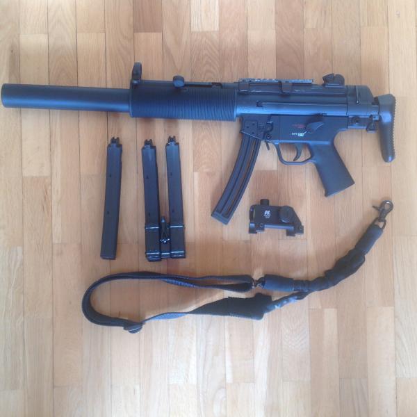 Vendo esta carabina con muy poco uso, se trata de una HK MP5 SD6 en calibre 22lr fabricada por Walther con licencia de HK, va con 4 cargadores de 25 cartuchos, 1 portacargador doble, correa tactica de 1 punto, carril y visor de punto rojo NcStar, en su caja original,con herramientas y manual de instrucciones