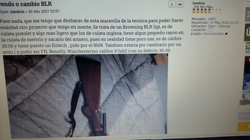 Jandrin escribió:Pues nada, que me tengo que deshacer de esta maravilla de la tecnica para poder hacer realidad otro proyecto que tengo en mente, Se trata de un Browning BLR ligt, es de culata pistolet y algo mas ligero que los de culata inglesa, tiene algun pequeño rayon en la culata de meterlo y sacarlo del armero, pues en realidad tiene poco uso, es de calibre 30.06 y tiene puesto un Eotech , pido por el 850€. Tambien estaria por cambiarlo por un semi ( a poder ser FN, Benelly, Winchester)en calibre 9'3x62 ò en su defecto 30-06
