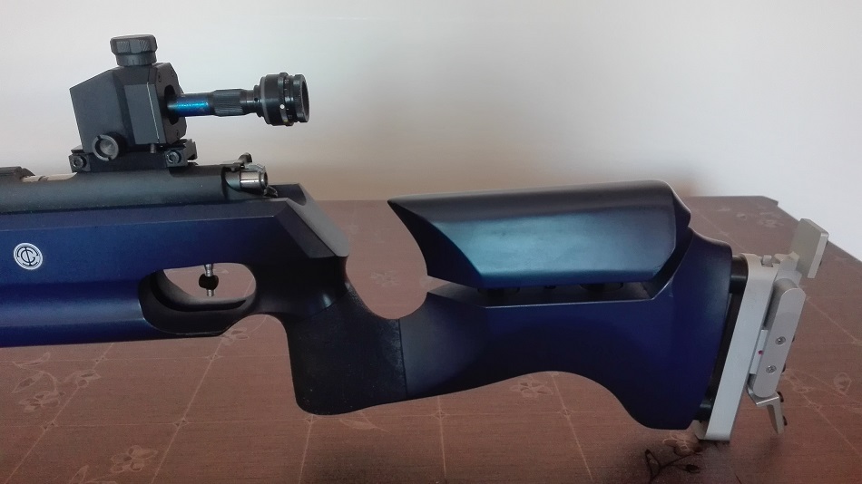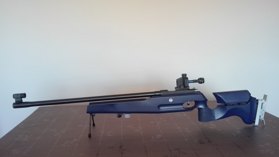Tanto el peso como la medida las tomé con la carabina tal cual aparece en la foto, con el diópter, túnel, tope de mano-anclaje de cinturón, y bípode.