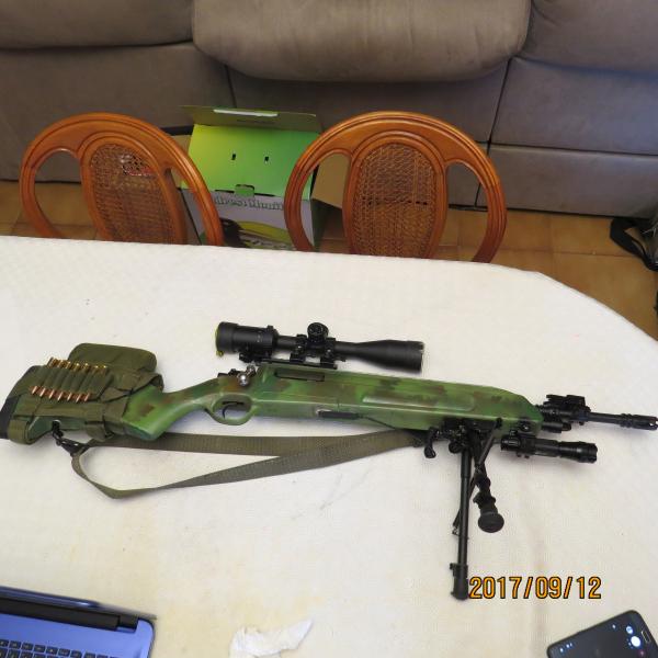 Te interesa este 308Win con todos los extras que se ven las monturas son removibles, y las miras abatibles,contacta por privado o por email a nimalmar@hotmail.com regalo 200 puntas de caza i 400 vainas la culata esta mimetizada pero se puede pintar negra con Pintura Krilon el precio es de 650 € con portes incluidos en Peninsula saludos Askasa