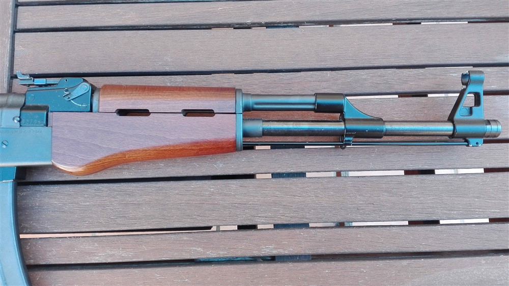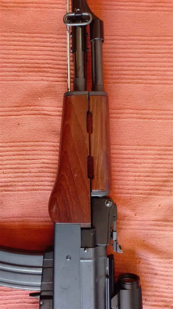 Está en muy buen estado, la aguja percutora y la uña extractora son nuevas, y tiene montado un raíl Picatinny/Weaver en la tapa del cajón de mecanismos (las fotos son del anterior propietario y aún no estaba instalado). También tiene el soporte lateral para colocarle la montura de visor típica de los AK, pero la montura no la tengo.