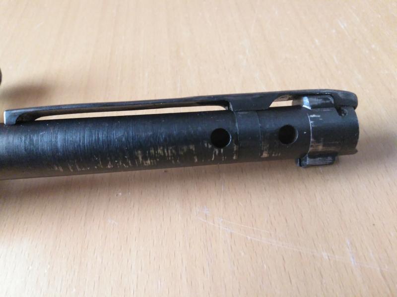 Los números del cerrojo también son coincidentes con el resto del arma, si bien creo que podrían haber sido renumerados posteriormente por los rusos para hacerlos corresponder, ya que por el tipo de acabado del cuerpo del cerrojo y la ausencia del tetón de guía este parece que correspondería con un arma producida ya en 1945 -Kriegsmodell- y no con un DOU 44.