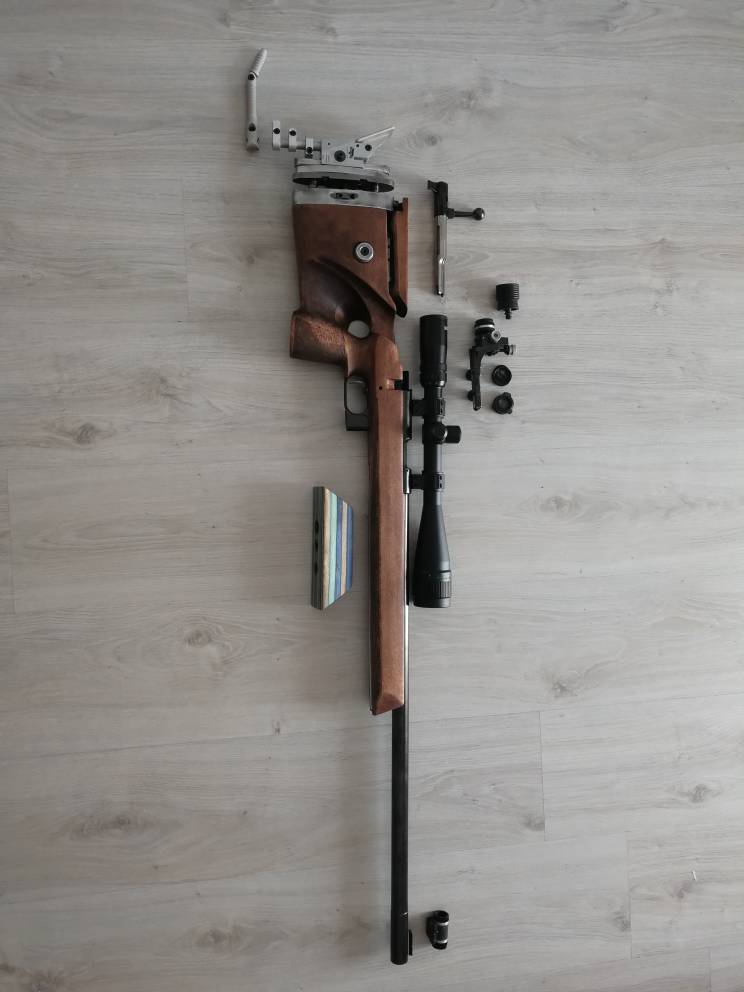 Vendo carabina Anschutz Match 54, calibre 22lr, con culata original, rail inferior para accesorios, y lo que se ve en las fotos excepto visor, aunque se podría incluir también. La cantonera como veis es la moderna, con rabera articulada. Esta solo, ya cuesta 300 euros. La carrillera es ajustable en altura. El diopter y el túnel tienen diferentes piezas con filtros y demás. No se muy bien como van porque no los he usado nunca. Siempre la he usado con visor. Se puede ver y probar sin compromiso. La culata es antigua, la original, y aunque está bien, ha tenido varias reparaciones, lijados... por otros propietarios. Ahora yo la tengo al aceite.