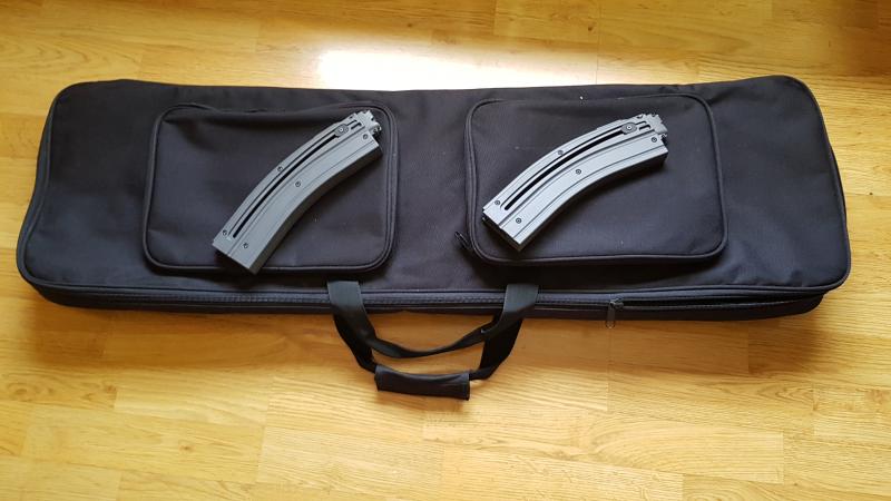 Tiene el cargador de serie corto (10) y cuatro largos (30), originales, no salieron baratos.