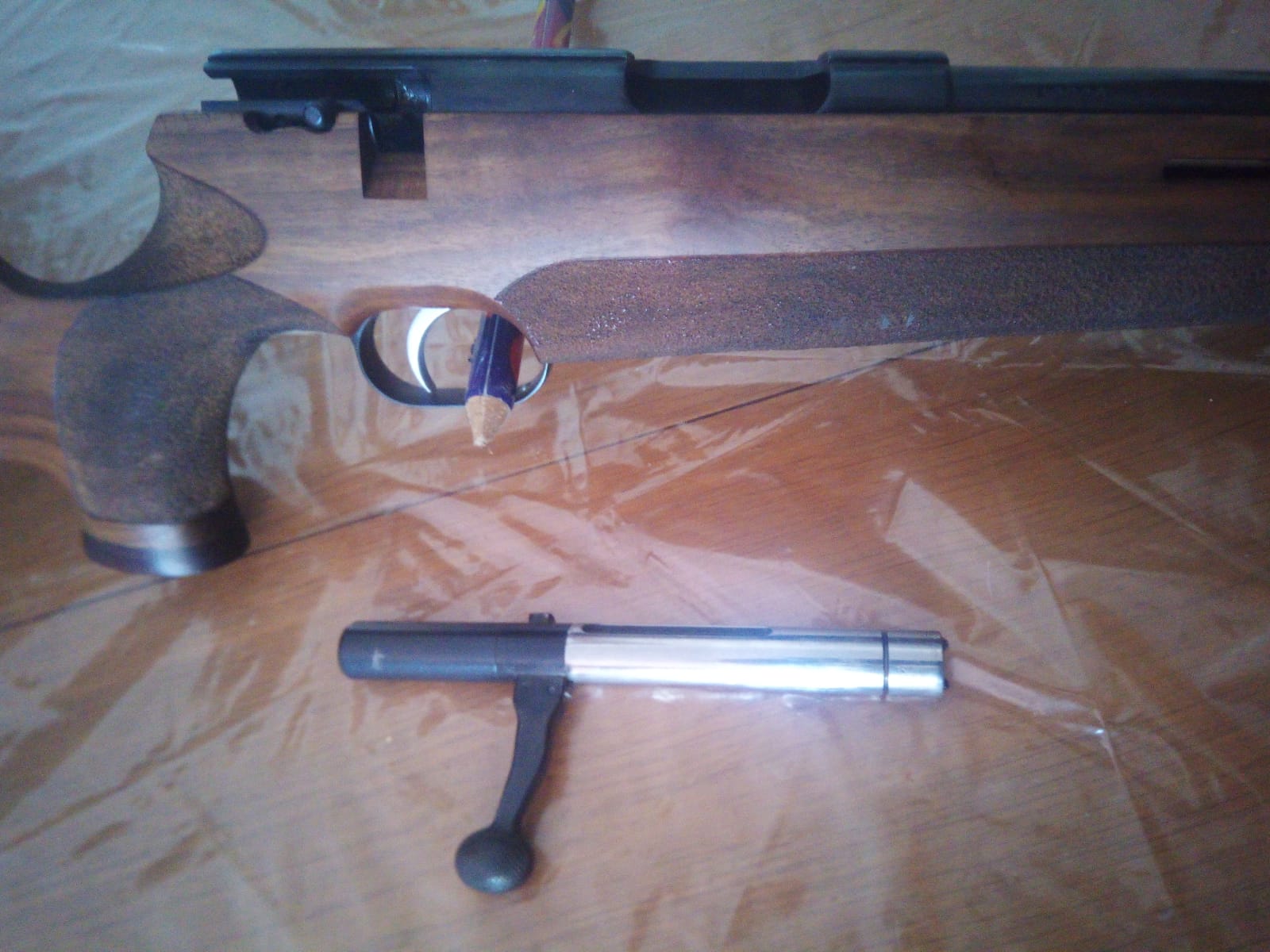 La primera es una WEIHRAUCH HW66, calibre 22, esta está a estrenar. Tiene culata de zurdo