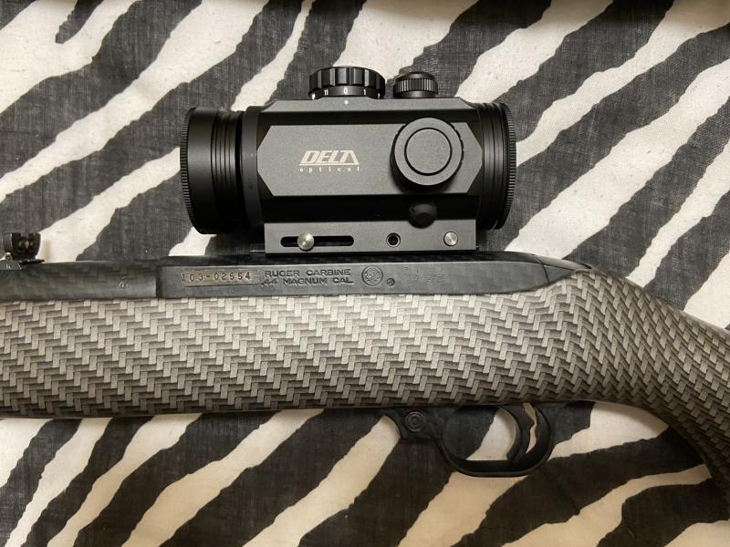 Es una oportunidad de estrenar un Ruger 44 completamente equipado y valoro el conjunto en 750€, un precio justo puesto que el rifle costó 500€, la hidroimpresión 180€, el carril 35€, el punto rojo 238€, la correa 6€ y la funda 60€.