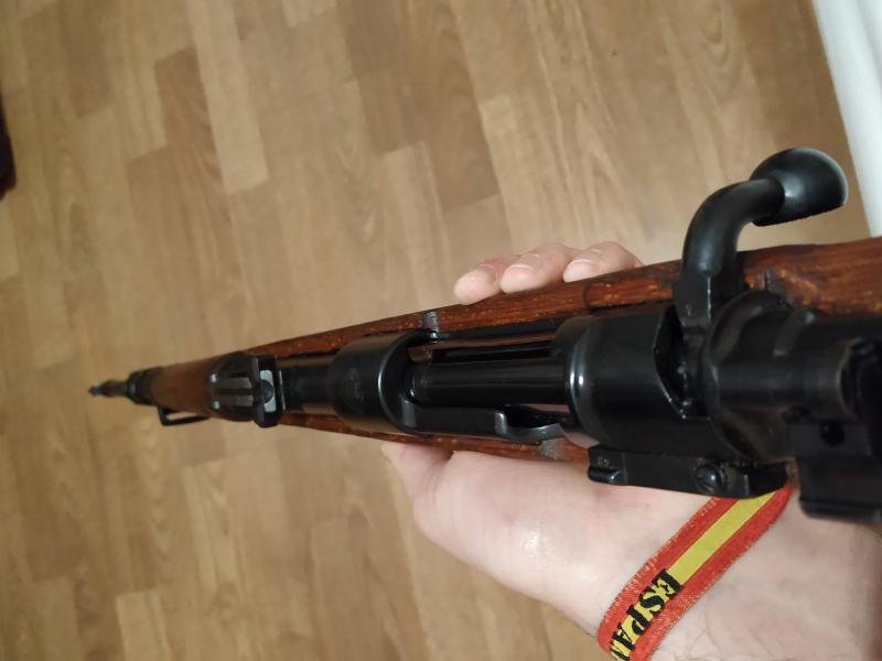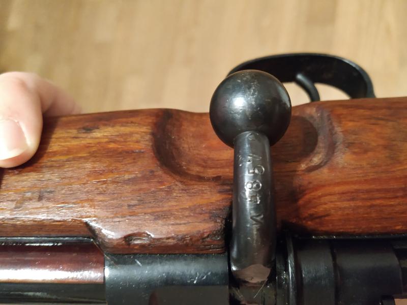 el cerrojo no es original de Kar 98, es plano por la parte que la bola toca contra la madera y llevara seguro un cuadrillado, ese cerrojo sera de un Kar 98az o de un Radom 98K , la tapa del cargador , tiene una numeracion borrada y añadida la suya , por lo tanto no coincide naturalmente en origen , el pavon en ninguno es original , puesto que en Yugoslavia les ponian cañones propios y nuevos al reacondicionarlos y los volvian a pavonar , las culatas las remarcaban , y podian ser la suya o no