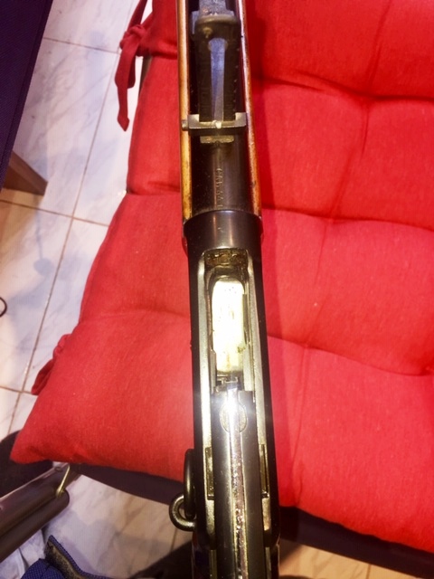 Tiene la palanca de carga, el martillo del percutor, la pletina de cierre de alimentación de la munición, los tetones del cierre y la uña extractora cromados como se aprecia en las fotos y el alza abatible calibrada para mayores distancias de disparo.