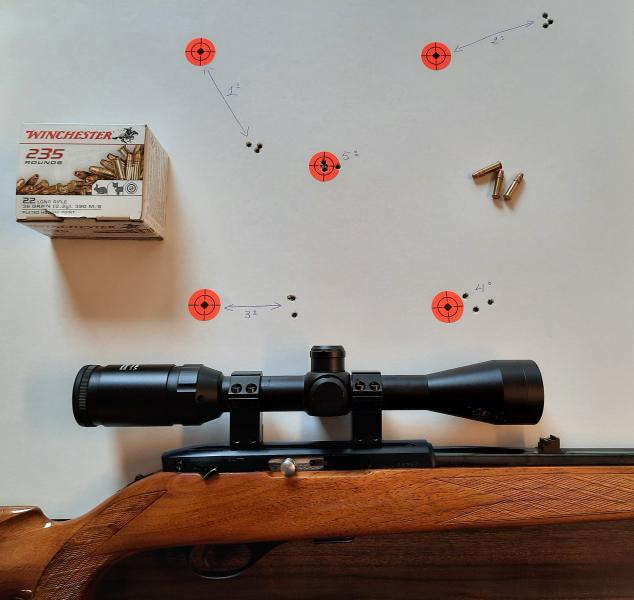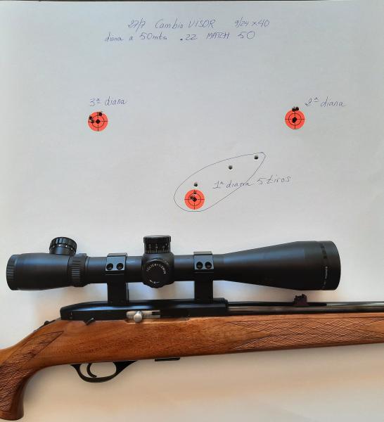 Adjunto foto del arma, otra de una diana a 50 metros y una tercera de puesta a tiro del visor con los cinco grupos de tres tiros. En una se ha utilizado CCI LR y en la otra Winchester LR. Utilizando una munición MATCH 50 los resultados son espectaculares.