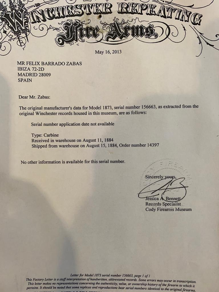 Entrego certificado de Winchester que acredita su originalidad y año de fabricación.