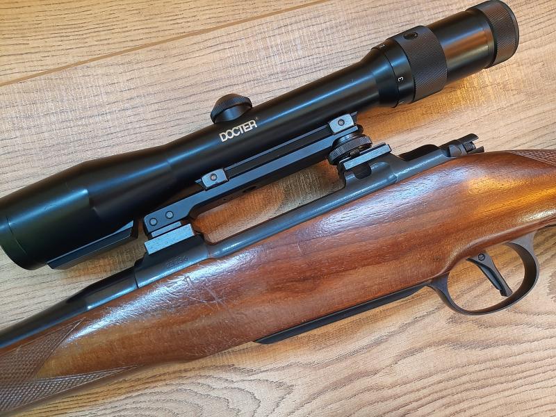 Rifle de cerrojo marca BRNO, modelo ZKK 602 (acción magnum), calibre 300 Win Mag + visor DOCTER 1,5-6x42, con monturas de puente giratorias de calidad (made in germany). El disparador tiene pelo francés y alza de librillo. Correa y funda de calidad con borreguiles.