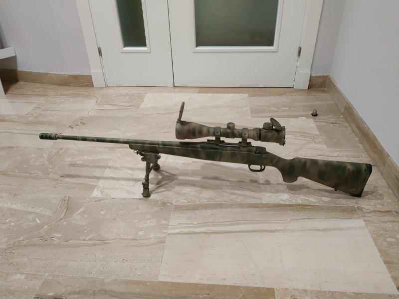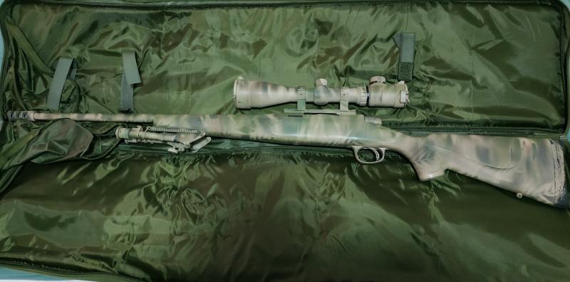 Pintado en camuflaje, con freno de boca, bipode, visor NCSTAR MAGNUM 3-12X50 GEN II. Incluye funda de transporte y porta cartuchos en culata extraíble.