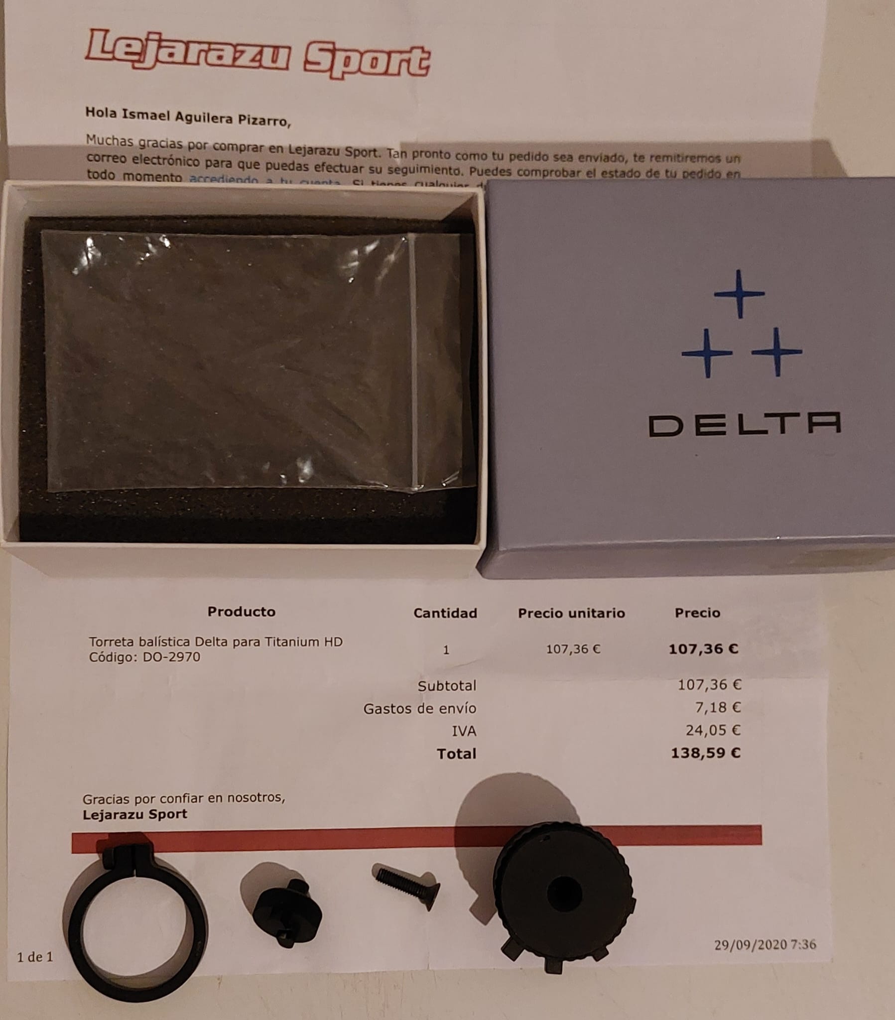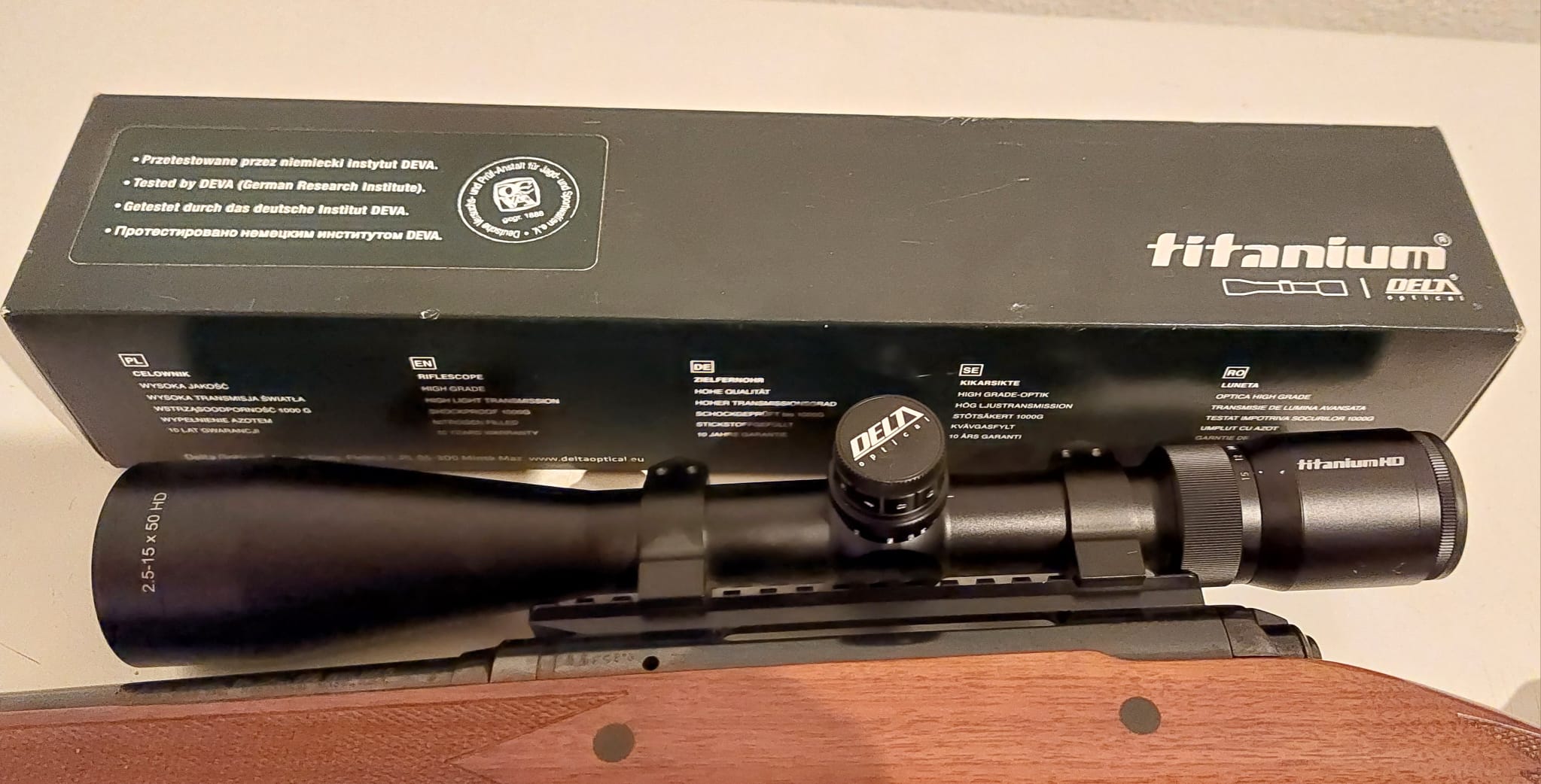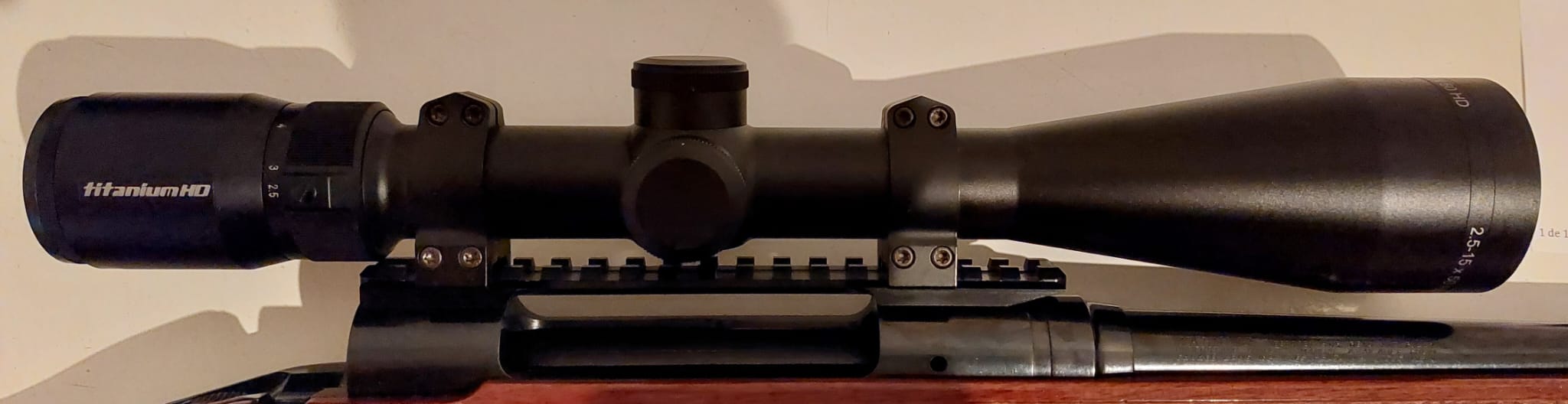 Monta visor marca Delta modelo Titanium HD SF de 2,5-15X50 con torreta balística Delta y retícula 4A iluminada con punto central. Monturas Warne Máxima fijas.