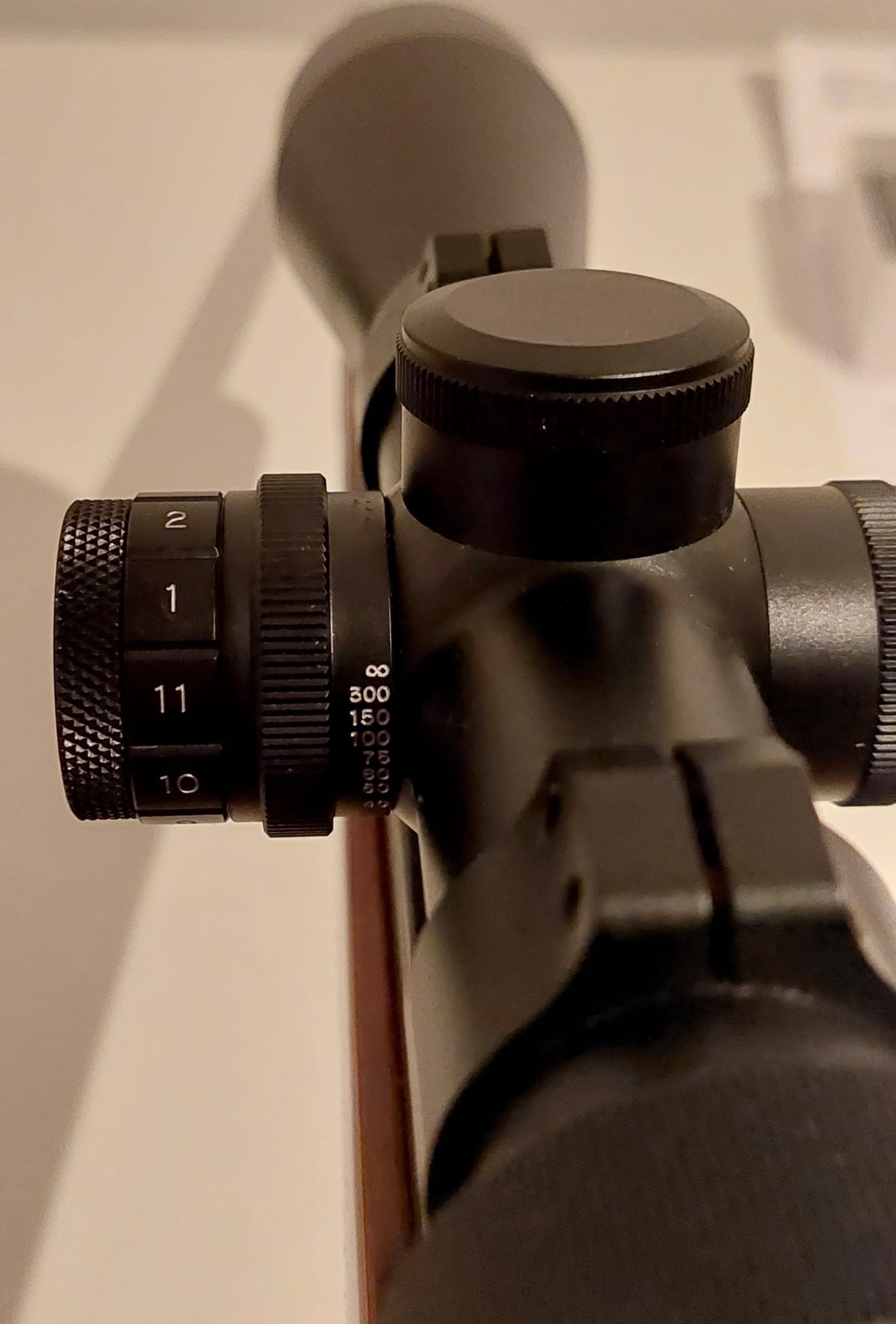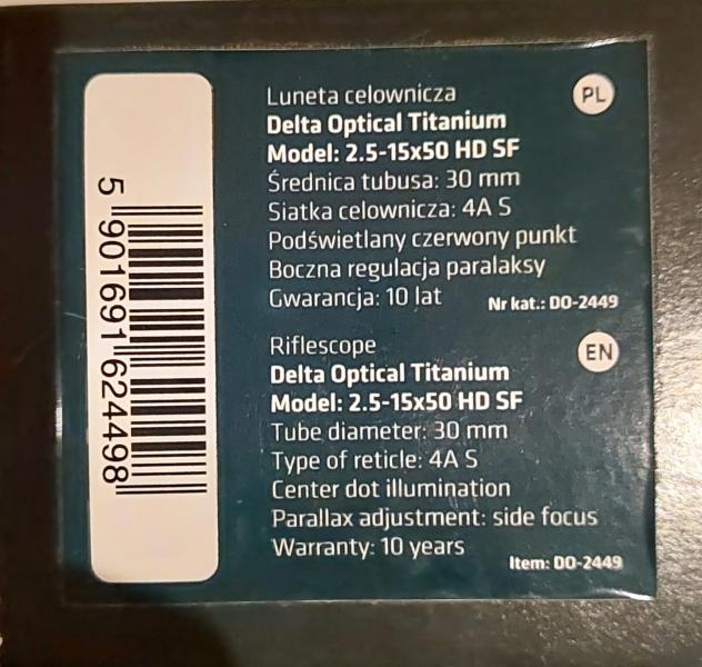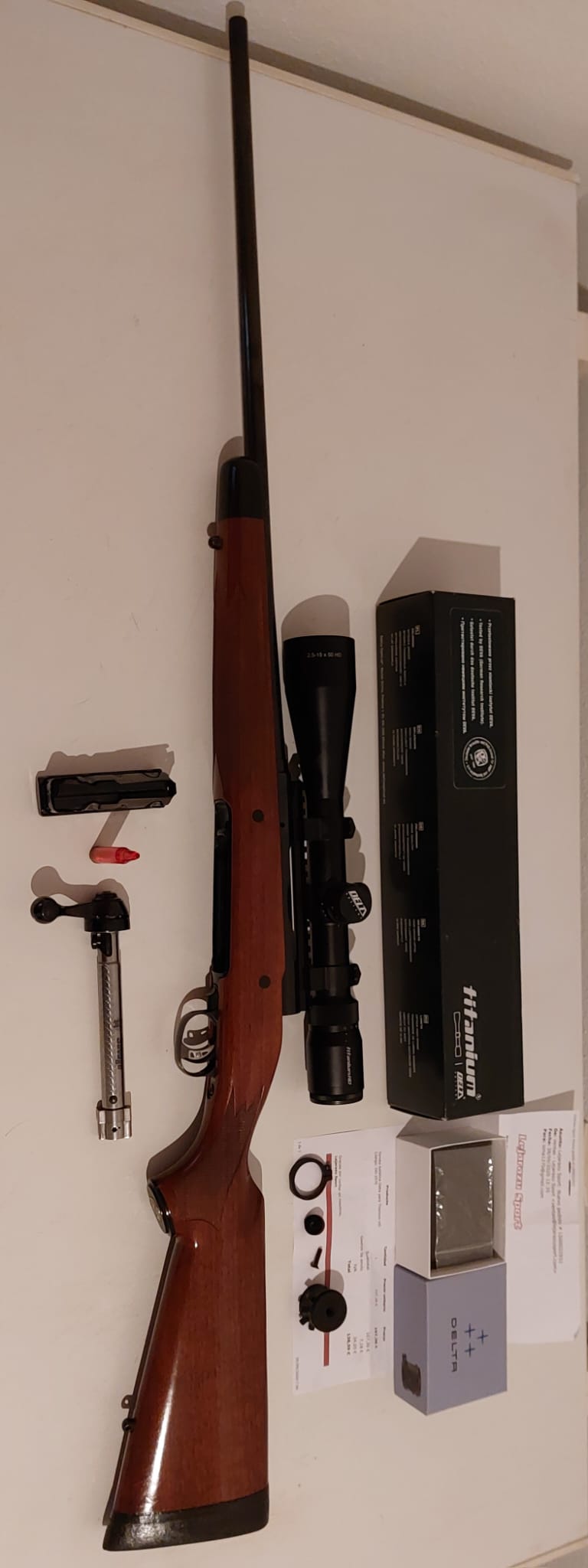 Monta visor marca Delta modelo Titanium HD SF de 2,5-15X50 con torreta balística Delta y retícula 4A iluminada con punto central. Monturas Warne Máxima fijas.