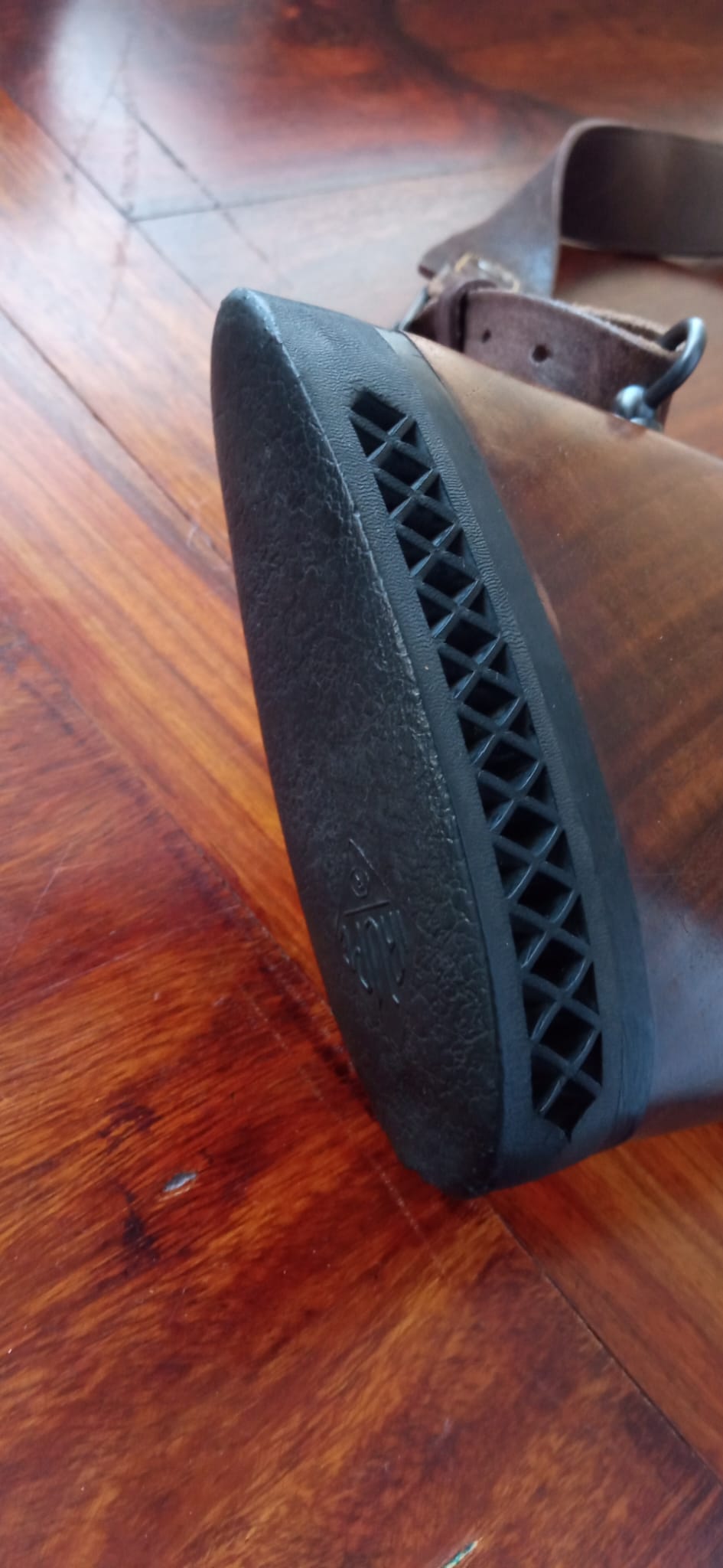 -. Cantonera ventilada de gran espesor IRUPE para amortiguar el culatazo. Tiene unos 15 años colocada en el arma, por lo que la goma presenta alguna grieta.
