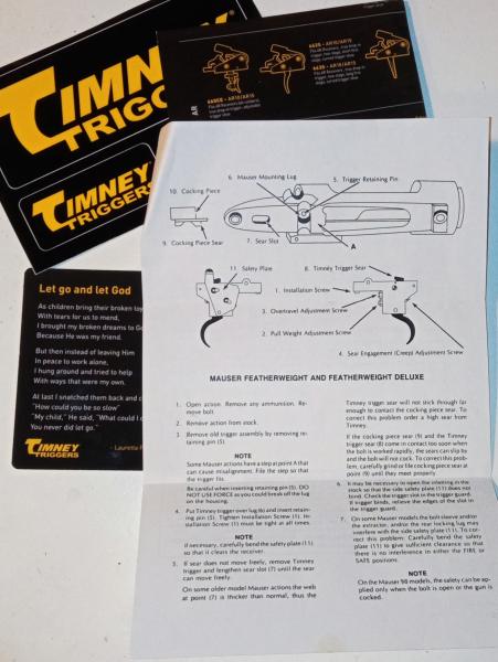 -. Gatillo Timney 301 regulable de 1.5-4 libras con seguro lateral y se entregan las instrucciones de regulación del Timney. Seguro de gatillo lateral, perfecto para la caza. Que no interfiere con el visor/cerrojo. Se entrega el gatillo original