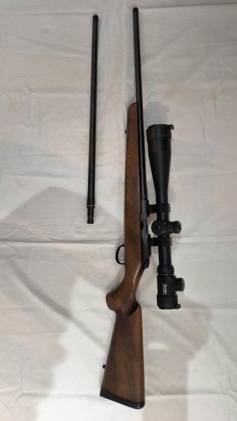 La carabina esta guiada con el cañón 22lr y como accesorio está el cañón 22WMR, ambos sin elementos de puntería y con rosca.