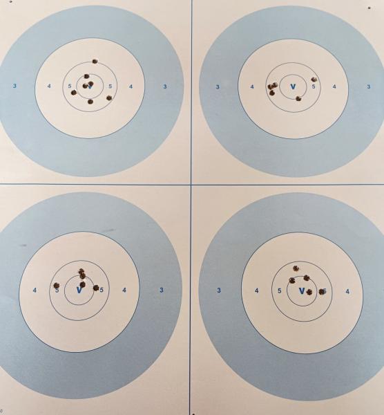 Buenas tardes, ver tirada efectuada a 300mt. Diametro del 5 son 7cm., de la V son 3,5cm. Saludos