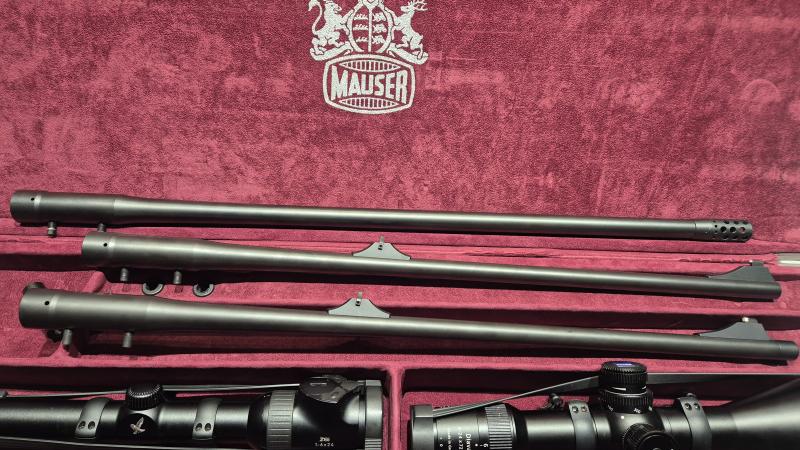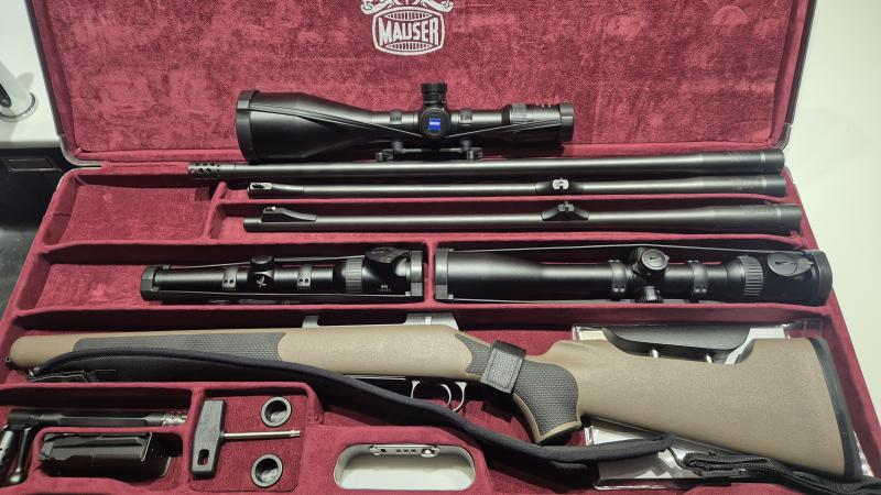 Vendo equipazo Mauser M03 Extreme Target en calibre 300weatherby con cañón semipesado de 65cm con rosca y freno de boca dual brake, gatillo pelo francés, cerrojo 60°, seguro de cargador, culata regulable, correa original Mauser, un rifle y calibre para hacer tiros increíbles, con solo 16 disparos realizados, agrupación de escándalo, tiene un cañón adicional del 8x68s de 62cm con 14 disparos y otro cañón del 375h&h de 62cm con rosca y freno de boca dual brake con 11 disparos, esta todo como que lo compras nuevo, tienen sus visores y monturas, un cargador adicional y un cabezal magnum adicional, solo el rifle tuvo un precio de compra de 4200€, específico precios, las monturas no se venden solas.