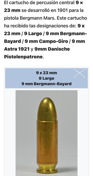 ***La otra del calibre 9 Largo (38 super), con cargador tresbolillo (similar al de pistolas Bergman), y no quiero omitir informar de una pequeña fisura en madera que puede repararse con Loctite y quedaría perfecta.