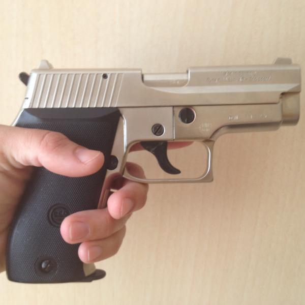 Imita a una Sig Sauer, tiene el PTB 636, de 9mm pak, viene con su manual y maletín original.